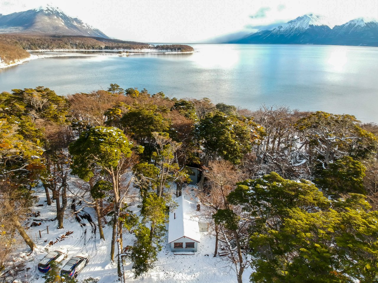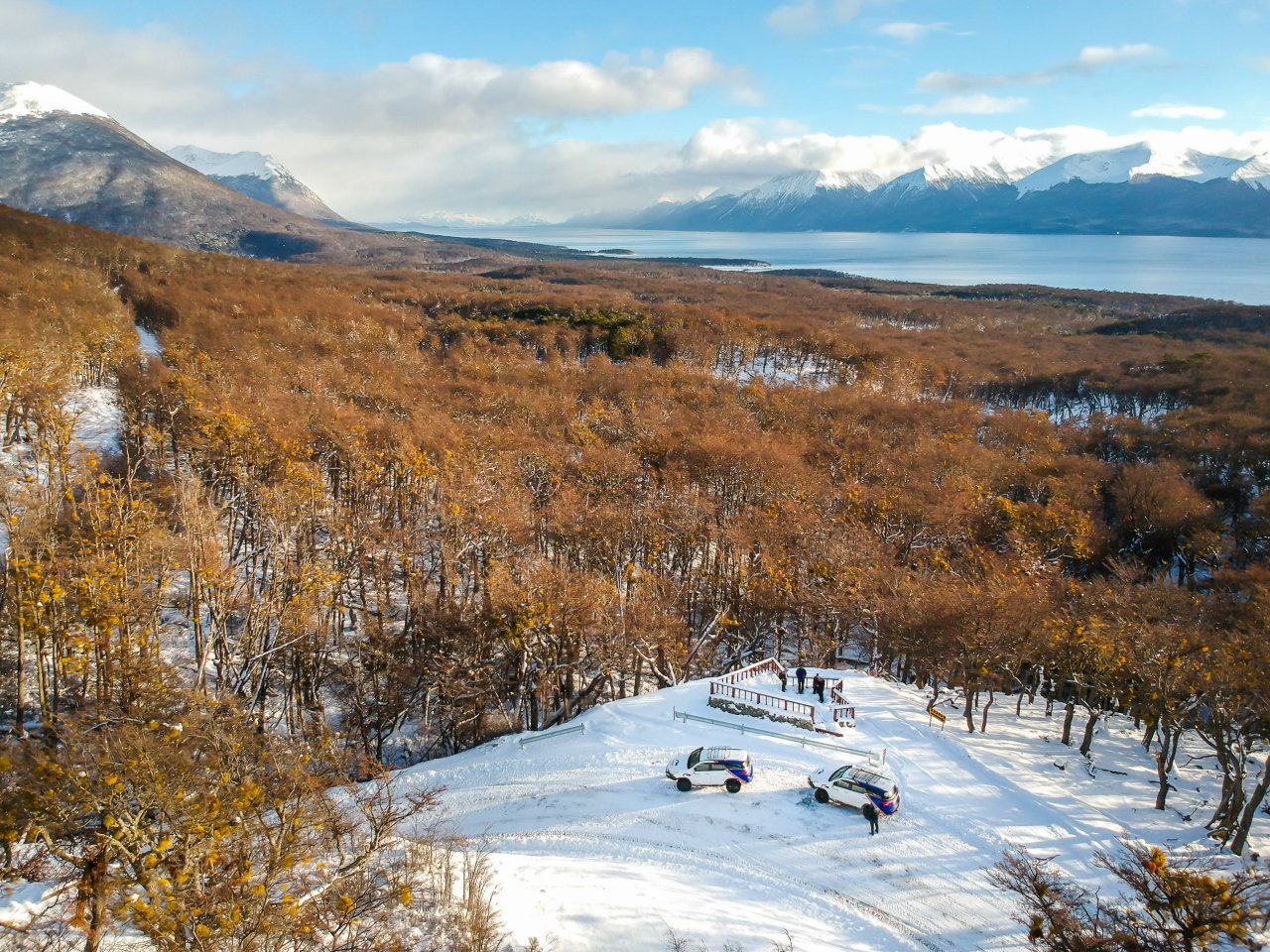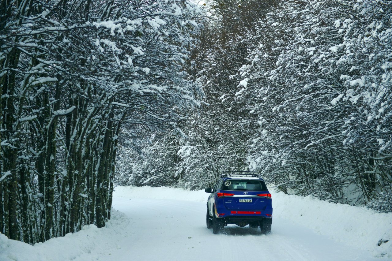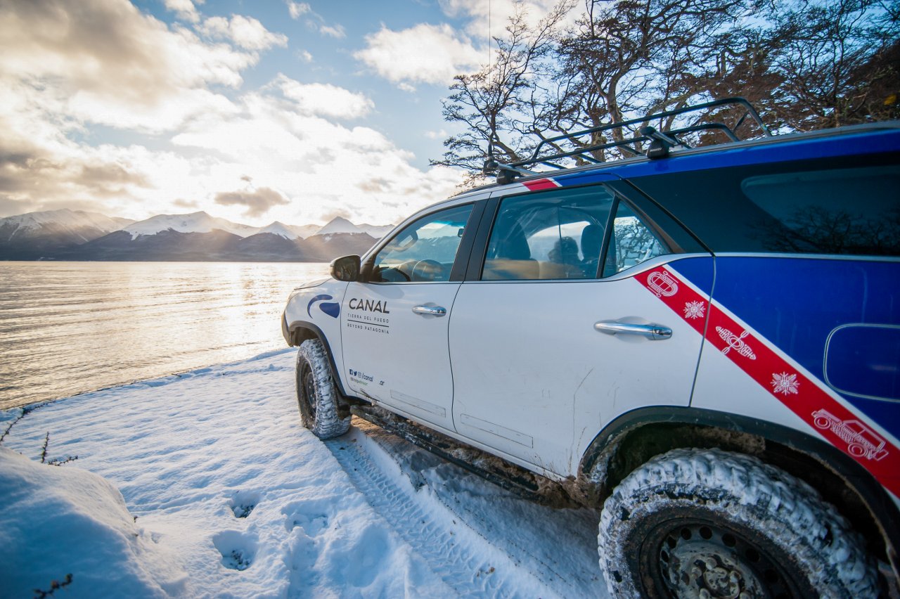Cerca del extremo norte del Lago Escondido, abandonaremos el asfalto para iniciar un emocionante recorrido off-road. Nos aventuraremos por los antiguos caminos de un aserradero, cubiertos de nieve y hielo, que pronto se transforman en desafiantes senderos intransitables para vehículos convencionales. Estos nos conducirán directamente al Lago Fagnano, el quinto lago más grande de Argentina, donde su vasta extensión nos dejará sin aliento.