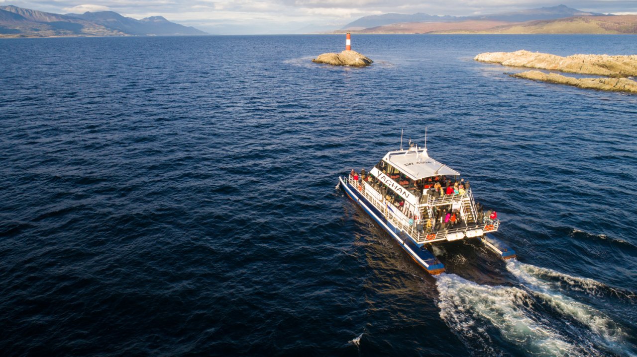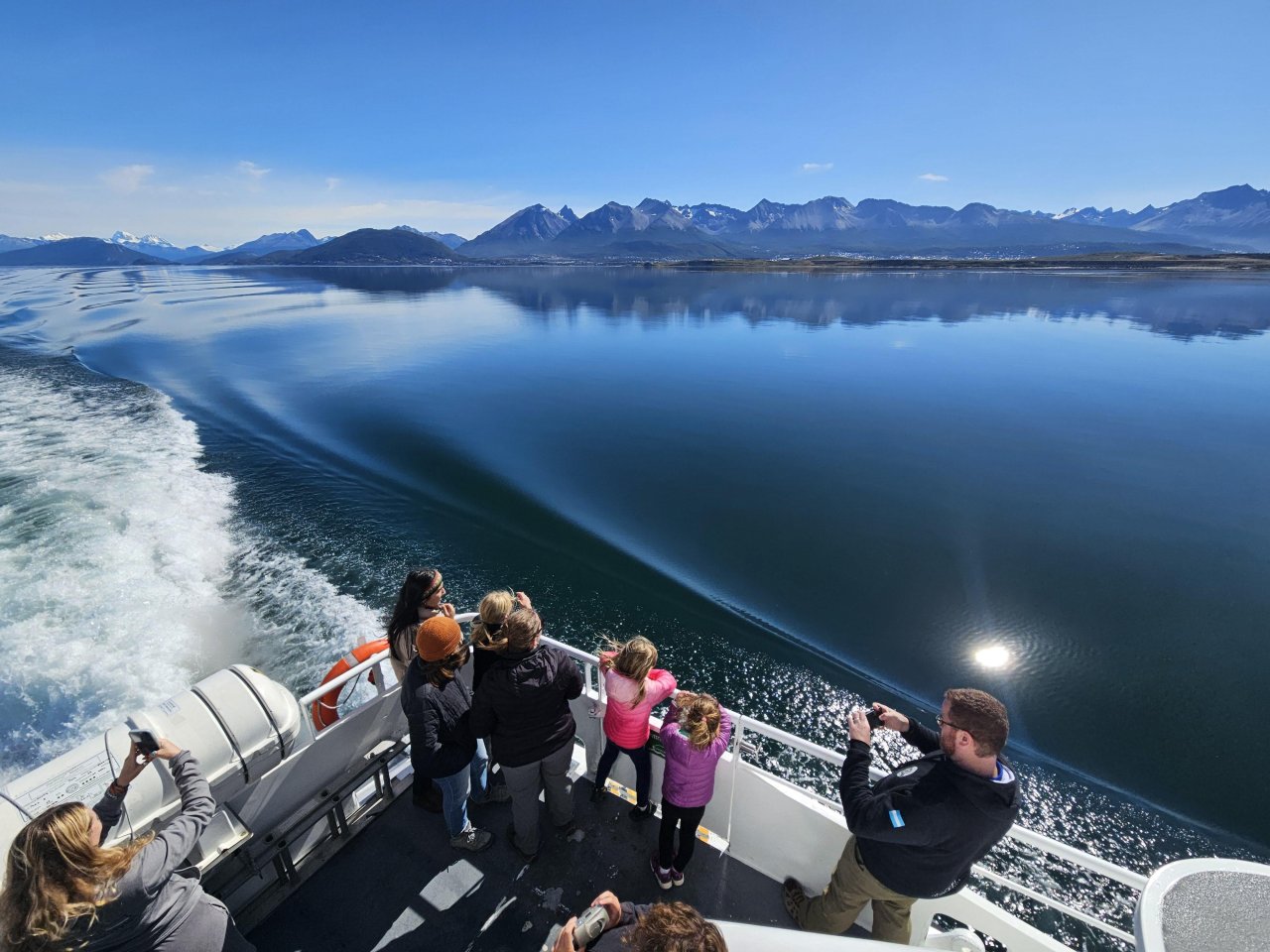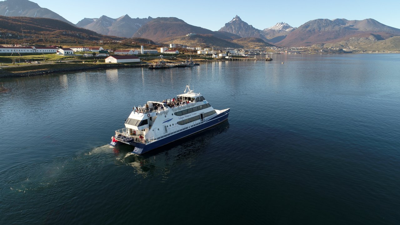 Comenzamos la navegación saliendo del Muelle Turístico de Ushuaia. A medida que nos alejamos de la costa, se puede disfrutar de una vista panorámica de la ciudad, donde se aprecian los edificios más importantes, como el Museo Marítimo (el antiguo presidio) y el Museo del Fin del Mundo, así como el área industrial y los majestuosos Montes Olivia y Cinco Hermanos.