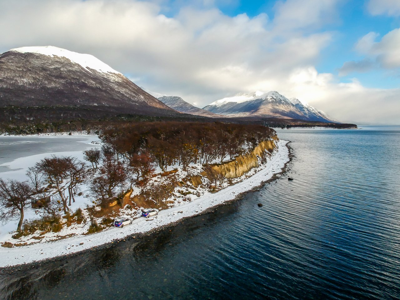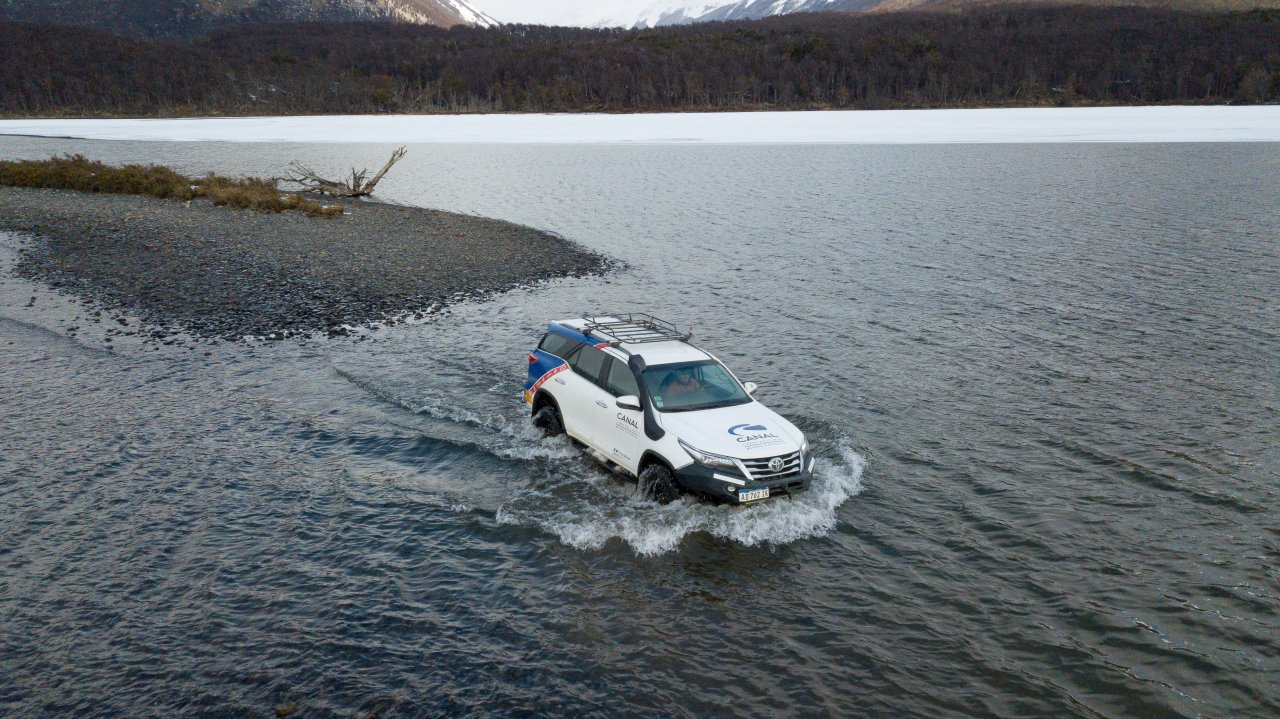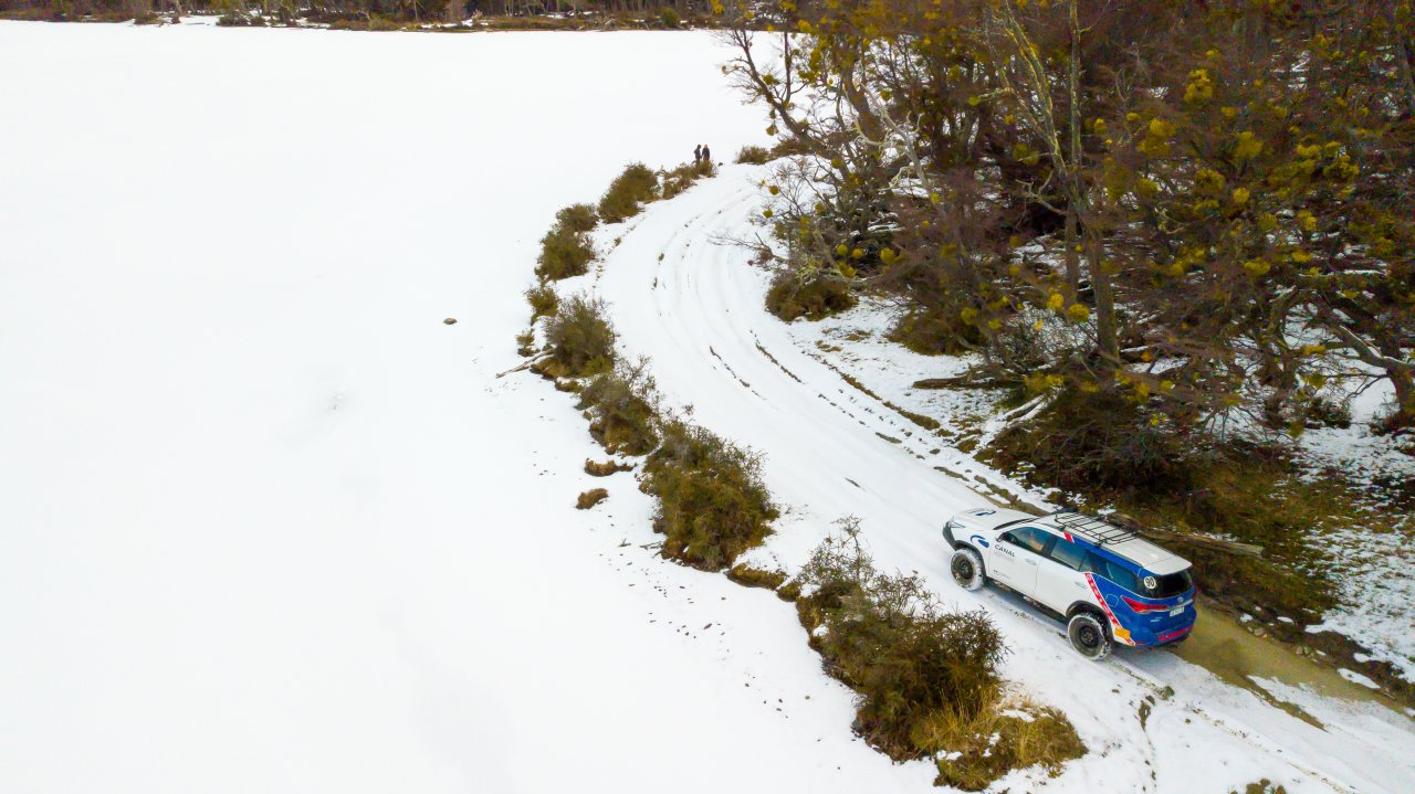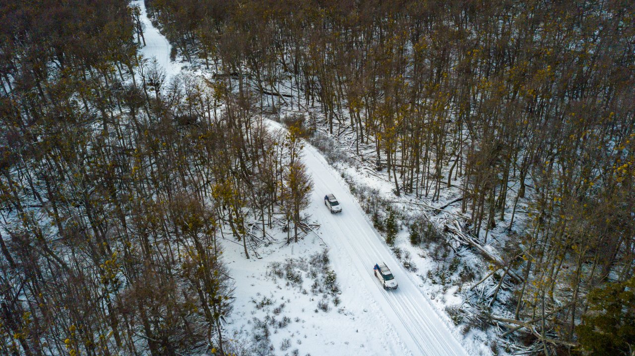Cerca del extremo norte del Lago Escondido, abandonaremos el asfalto para iniciar un emocionante recorrido off-road. Nos aventuraremos por los antiguos caminos de un aserradero, cubiertos de nieve y hielo, que pronto se transforman en desafiantes senderos intransitables para vehículos convencionales. Estos nos conducirán directamente al Lago Fagnano, el quinto lago más grande de Argentina, donde su vasta extensión nos dejará sin aliento.