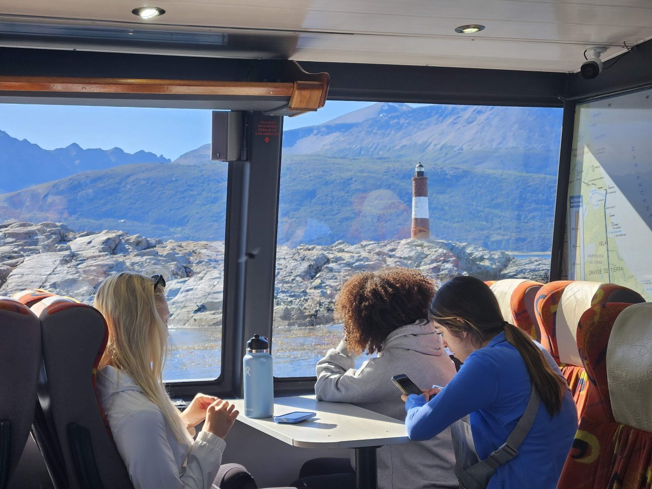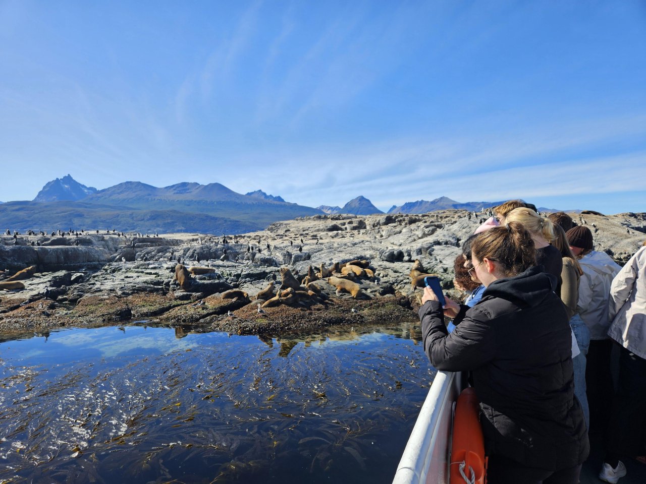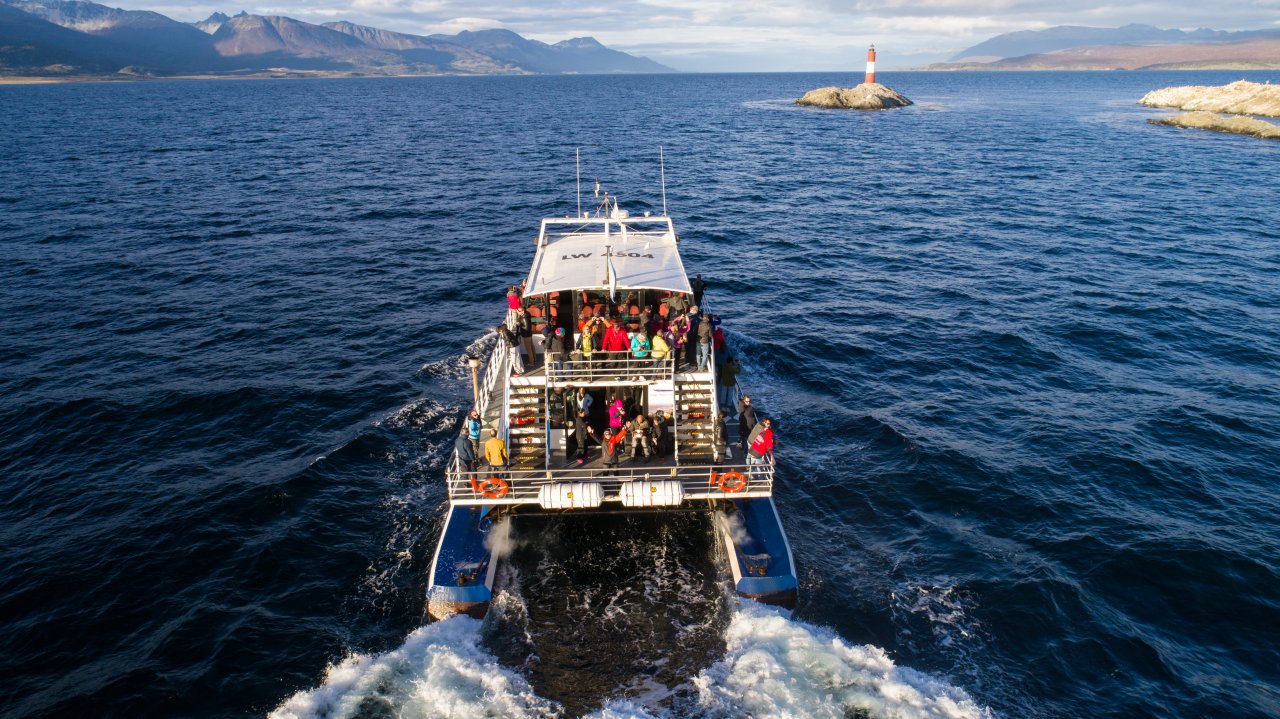 Comenzamos la navegación saliendo del Muelle Turístico de Ushuaia. A medida que nos alejamos de la costa, se puede disfrutar de una vista panorámica de la ciudad, donde se aprecian los edificios más importantes, como el Museo Marítimo (el antiguo presidio) y el Museo del Fin del Mundo, así como el área industrial y los majestuosos Montes Olivia y Cinco Hermanos.